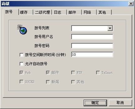 点击该按钮可打开如图1-2所示的“设置”界面进行基础设置,点击该界面中的“高级”按钮可进一步打开图1-3所示的高级设置界面,CCProxy的一些高级功能――比如自动拨号、二级代理等――都是在此设置的。