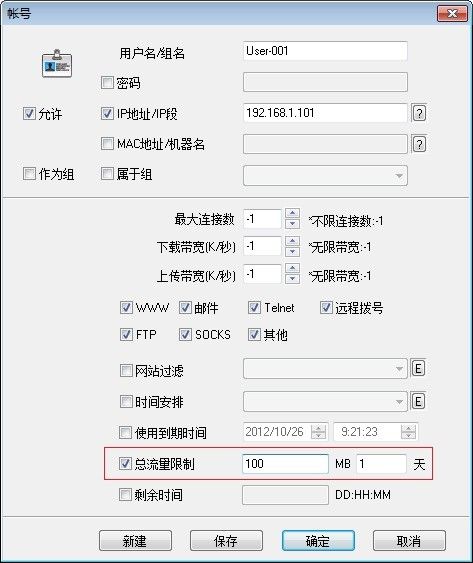 请在代理服务器主界面上,单击“账号”按钮,然后选中要对其流量限制的账号。单击“编辑”按钮,如下图所示,对客户端每天的流量限制,可对不同的客户端的需要求设置不同的流量限制,从而达到更好的管理。