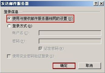 11) 在弹出的“发送邮件服务器”对话框中,选中“使用与接收邮件服务器相同的设置”单选按钮,然后单击“确定”按钮(如图 1‑13)。