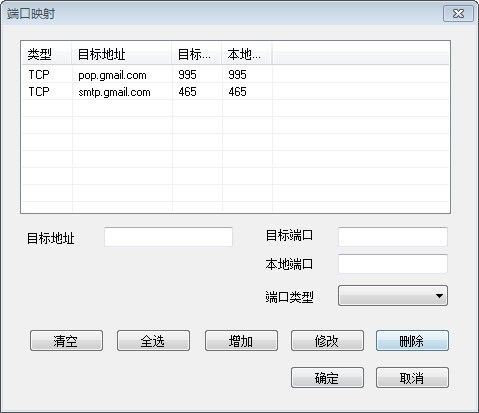 与此方法相似,再添加一条SMTP地址的端口映射规则,在“目标地址”编辑框中输入gmail的smtp地址“smtp.gmail.com”,在“目标端口”和“本地端口”中都输入“465”,单击“端口类型”组合框,选择“TCP”,最后单击“增加”按钮。