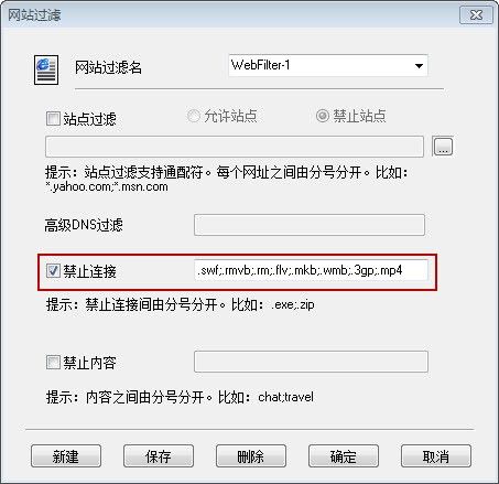 使用网站过滤限制视频文件,可以通过站点过滤和禁止连接两种方式,两种方式也可以同时使用。