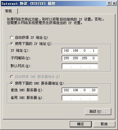 3) 服务器的网卡一般不要设置网关,尤其是连接局域网的网卡,不要设置网关,否则很容易造成路由冲突。如果您的服务器上有两块网卡,那么连接局域网的网卡可以参考(图 1‑5)进行设置。