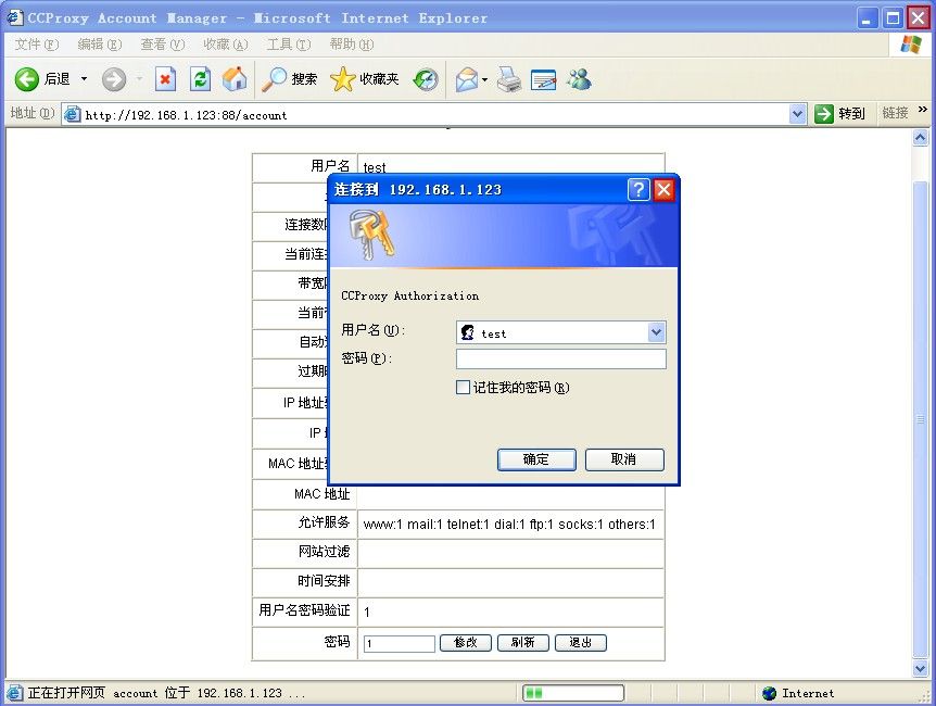 2) 打开CCProxy帐号管理页面,在“密码”编辑框中,设置新的密码,将密码“123”改成“1”,再单击“修改”按钮(如图 1‑1)。